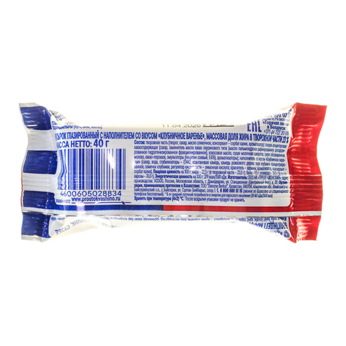 творожная часть (творог, сахар, масло сливочное, консервант – сорбат калия, ароматизатор); глазурь кондитерская (сахар, заменитель масла какао лауринового типа (масло пальмоядровое рафинированное дезодорированное гидрогенизированное фракционированное), кокосовое масло, сухое обезжиренное молоко, какао-порошок, эмульгаторы (лецитин соевый, Е476), ароматизаторы); наполнитель со вкусом «Клубничное варенье» (сахар, вода, пюре клубники концентрированное, кукурузный крахмал, семечки клубники, регулятор кислотности – лимонная кислота, стабилизаторы – камедь рожкового дерева, ксантановая камедь; красители – кармины, каротины; ароматизатор, консервант – сорбат калия).