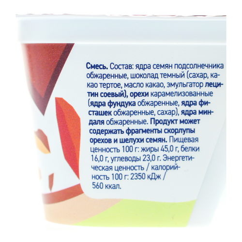 Состав: Йогурт: обезжиренное молоко, наполнитель «Фисташка» (вода, сахар, загуститель — пектины, концентрированный морковный сок, паста из фисташек, натуральный ароматизатор, концентрированный лимонный сок, краситель — хлорофиллы), сливки, йогуртовая закваска. Смесь: ядра семян подсолнечника обжаренные, темный шоколад (сахар, какао тертое, масло какао, эмульгатор — соевый лецитин, натуральный ароматизатор), орехи карамелизованные (ядра орехов фисташки обжаренные, ядра орехов фундука обжаренные, сахар), ядра орехов миндаля обжаренные.