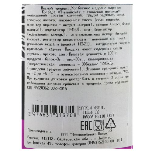 Состав: Свинина, грудка куриная, вода, топленое молоко, посолочная смесь (соль пищевая, фиксатор окраски нитрит натрия), специи (перец белый молотый), эмульгатор (Е450), стабилизатор (ксантановая камедь), антиокислитель аскорбиновая кислота, регулятор кислотности усилитель вкуса и аромата (Е621), натуральный пищевой краситель кармин.
