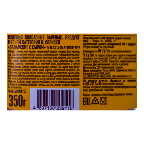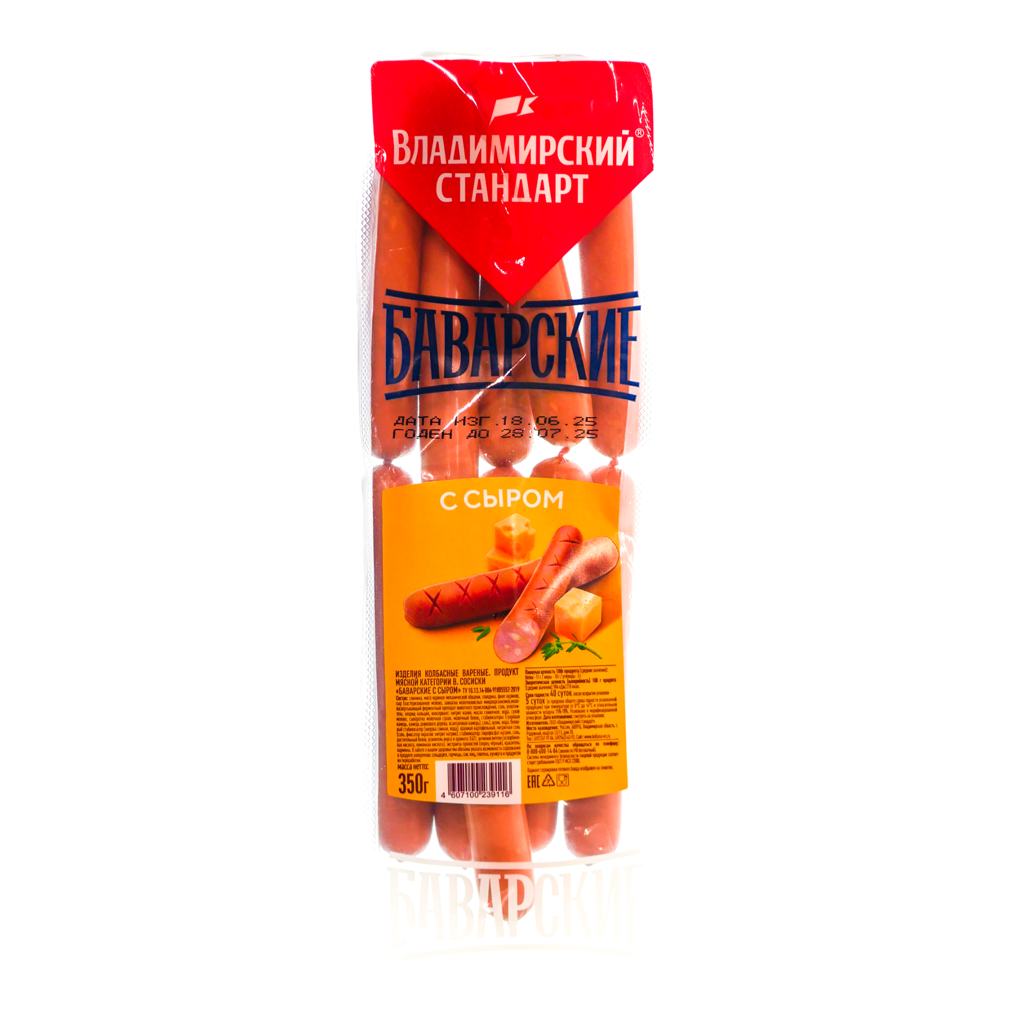 Сосиски Баварские сыром - любимый продукт и детей и взрослых, уникальная разработка и гордость технологов Владимирского стандарта. Изюминка технологии - добавление сыра твердых сортов, который при приготовлении тает, обогащая и дополняя продукт. Идеальное блюдо для занятого человека. В заботе о вашем здоровье мы обязаны указать возможность содержания в продукте аллергенов: сельдерея, горчицы, сои, яиц, глютена, кунжута и продуктов их переработки.