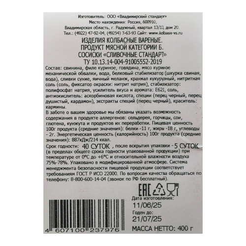 Сосиски Владимирский стандарт 400г Сливочные вареные