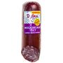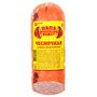 Состав: Свинина, шпик, вода, посолочно-нитритная смесь (соль, фиксатор окраски (нитрит натрия)), молочный белок, белок животный (свиной), стабилизатор (дигидропирофосфат натрия), усилитель вкуса и аромата (глутамат натрия 1-замещенный), антиокислители (изоаскорбат натрия, лимонная кислота), ароматизаторы, гемоглобин, декстроза, сахар, чеснок, краситель (кармины).