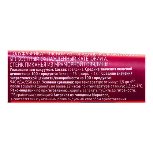 Охлажденный стейк пиканья из говядины Black Angus от «Мираторга» сочетает в себе непревзойденный вкус и сочность мраморной говядины. Это традиционное блюдо жителей Латинской Америки. На каждом кусочке есть небольшой слой жира, благодаря которому после обжарки стейк получается мягким, вкусным и поджаристым. Изготовлен из мяса быков породы Black Angus, которое отличается наличием мелких жировых прослоек, похожих на рисунок мрамора. Готовьте его на гриле, на сковороде или запекайте в духовом шкафу.