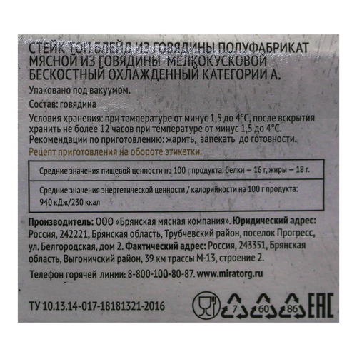 Стейк Топ Блейд из мраморной говядины Black Angus вырезается из блейда, который выделяется из лопаточной части. Сочный и нежный альтернативный стейк, лишь немного уступающий по своим характеристикам премиальным стейкам. В приготовлении также прост, как и другие стейки. Подробный рецепт размещен на обратной стороне этикетки.