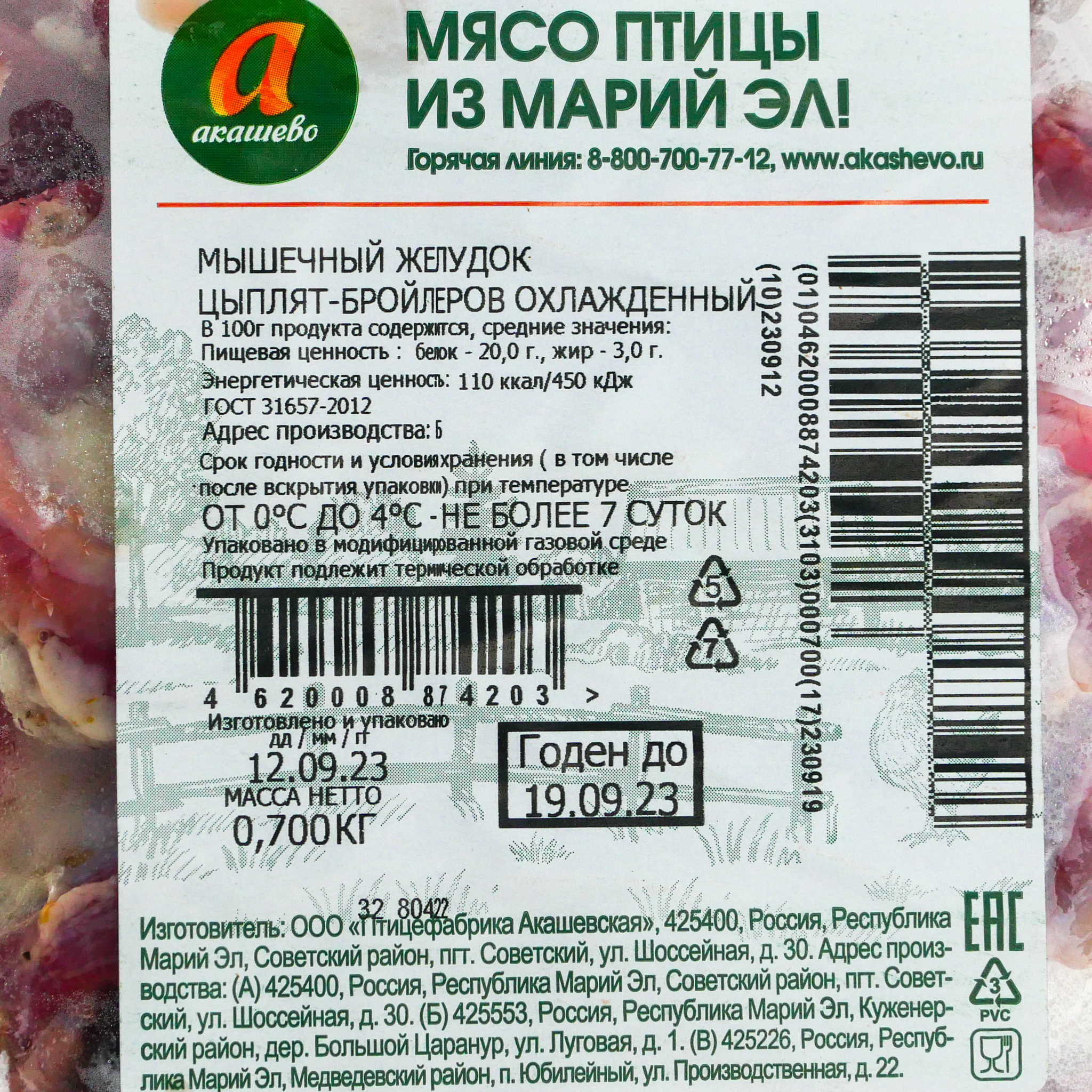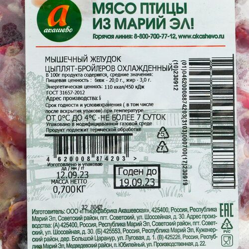 Состав: Мышечный желудок цыплят-бройлеров охлажденный.