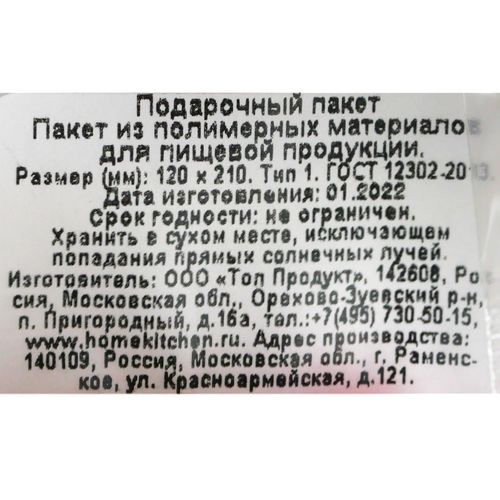 Подарочный пакет из полимерных материалов для пищевой продукции 120*210 мм.