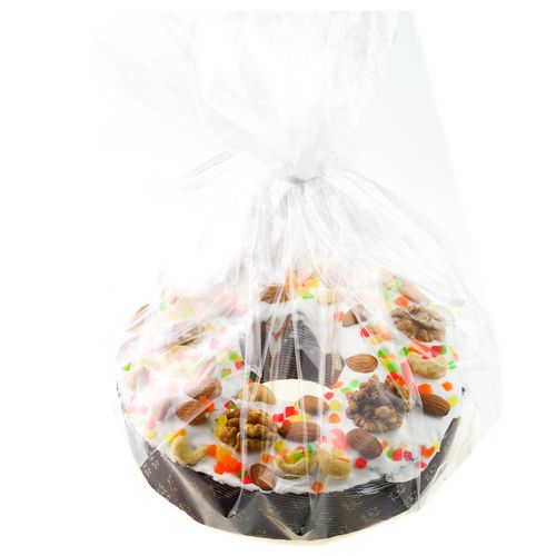Состав: Мука высшего сорта, помадка сахарная, цукаты кубик, сахар, вода питьевая, изюм, маргарин песочно-молочный, яйцо, молоко, орех грецкий, орех кешью, орех миндаль, улучшитель, соль, дрожжи, масло растительное.