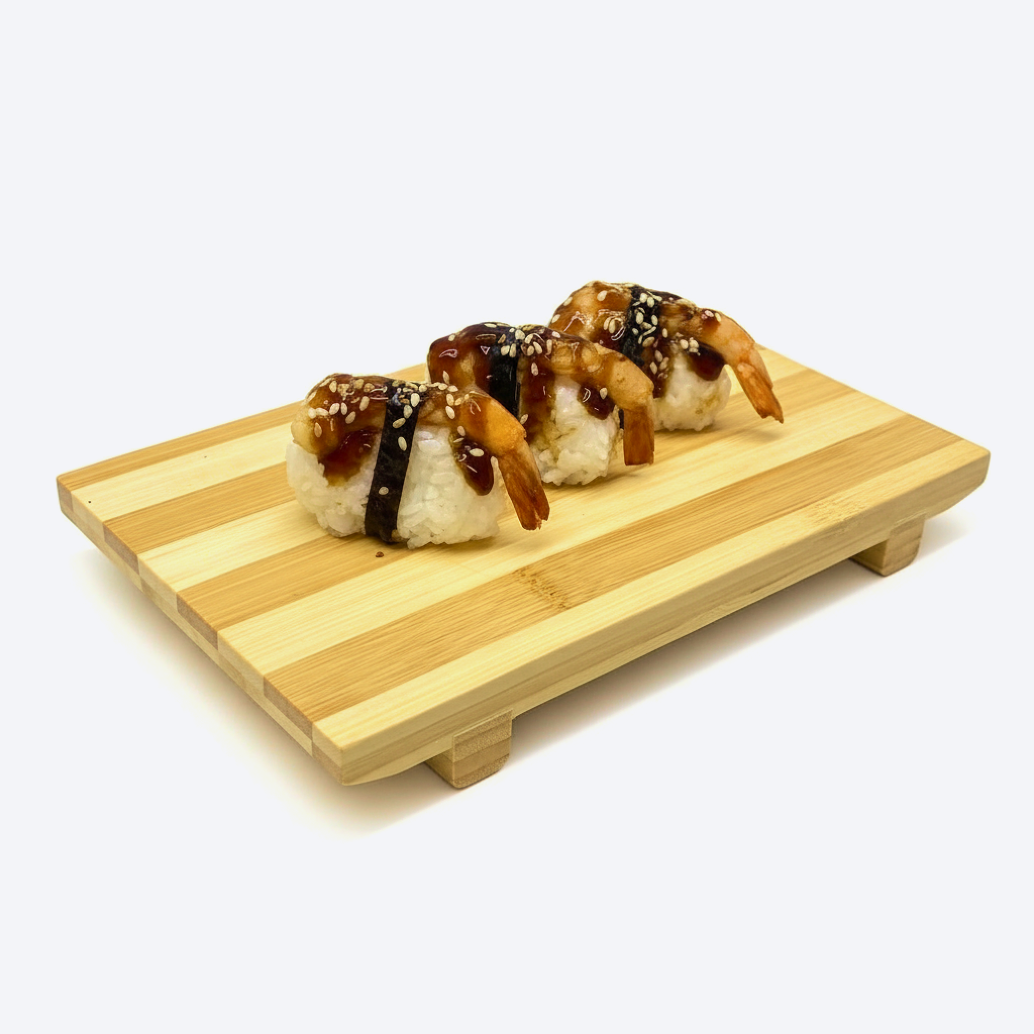 рис д/суши, креветка жареная, соус соевый, чеснок, соус терияки ,лист нори, кунжут.