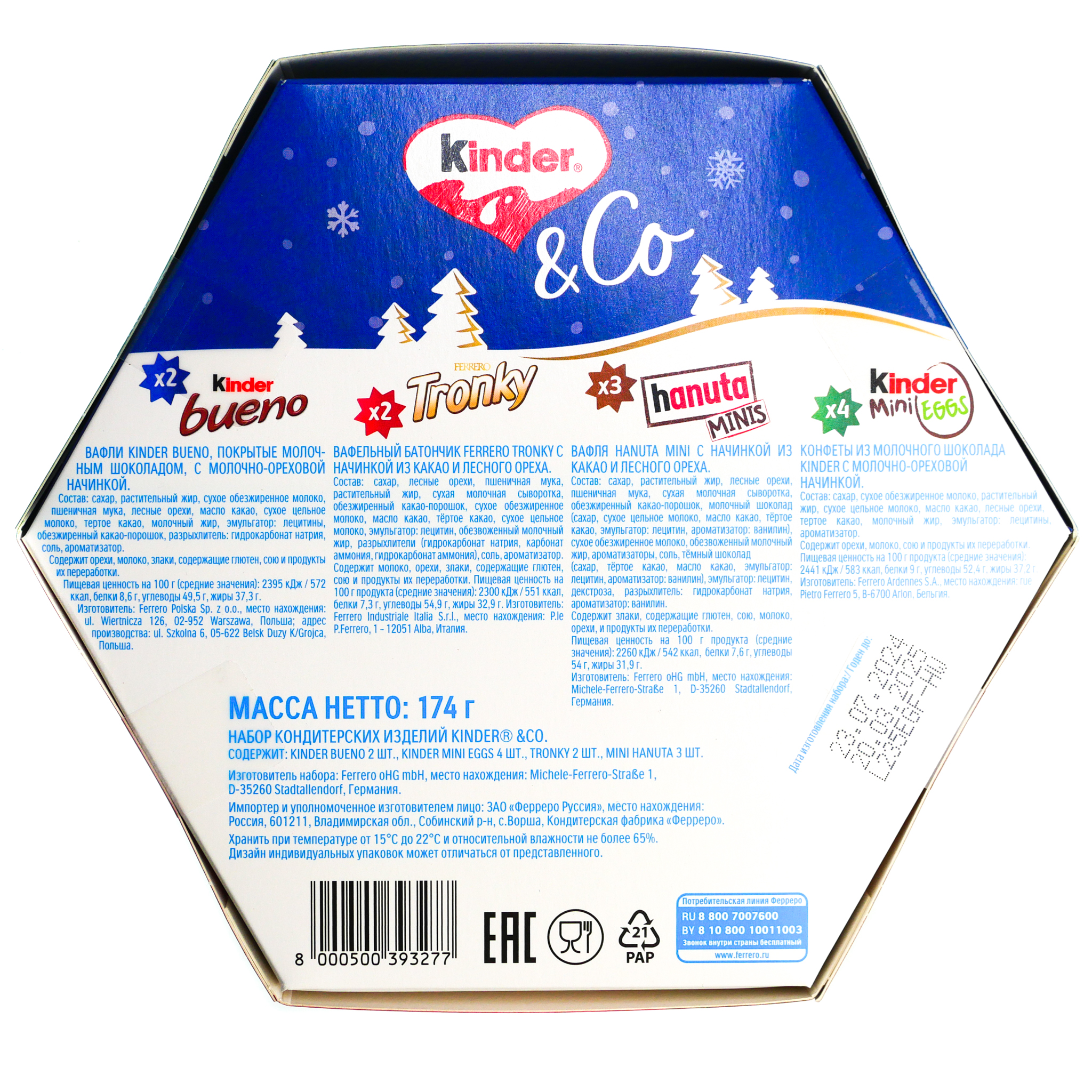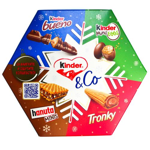 Новогодний подарок Kinder&Co 174 г — это сладкий набор, который придётся по вкусу каждому: и детям, и взрослым. Внутри набора есть полюбившиеся продукты Kinder, а также эксклюзивные сладости Ferrero.