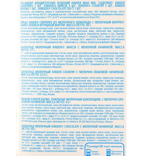В наборе: яйцо Kinder Сюрприз — 1 шт.; вафли Kinder Bueno — 1 шт.; шоколад молочный Kinder Chocolate (50 г) — 1 шт.; шоколад молочный Kinder Maxi — 3 шт.; шоколад молочный Kinder Country Chocolate со злаками — 2 шт.