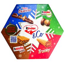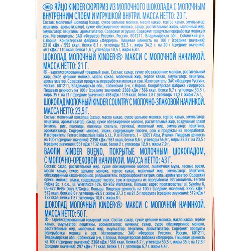 В наборе: яйцо Kinder Сюрприз — 1 шт.; вафли Kinder Bueno — 1 шт.; шоколад молочный Kinder Chocolate (50 г) — 1 шт.; шоколад молочный Kinder Maxi — 3 шт.; шоколад молочный Kinder Country Chocolate со злаками — 1 шт.