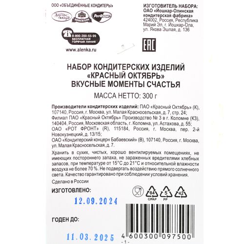 Состав: Состав подарка: 1. Конфеты Ну ка отними 10.4г - 2шт 2. Конфеты Мишка косолапый 13.9г - 1шт 3. Конфеты Морские 14.9г - 1шт 4. Конфеты Кара Кум 15г - 1шт 5. Конфеты Мишка Косолапый Медовый грильяж 13.7г - 1шт 6. Конфеты Трюфели вкус имбирно-пряничный 12.5г - 1шт 7. Конфеты грильяж в шоколадной глазури 14.2г - 1шт 8. Конфеты Нива 14.9г - 1шт 9. Конфеты Красная шапочка 13.9г - 2шт 10. Конфеты Мама приехала 13г - 1шт 11. Конфеты Чарли Кэмбер со вкусом сыра 11.2г - 1шт 12. Конфеты Kinocorn со вкусом попкорна 13г - 2шт 13. Конфеты Картошка 13.3г - 2шт 14. Конфеты Восточный грильяж 13.3г - 1шт 15. Конфеты Козиначки с солью 13.2г - 2шт 16. Конфеты Батончики 15.1г - 1шт 17. Шоколад Аленка 20г - 1шт Итого: 22шт