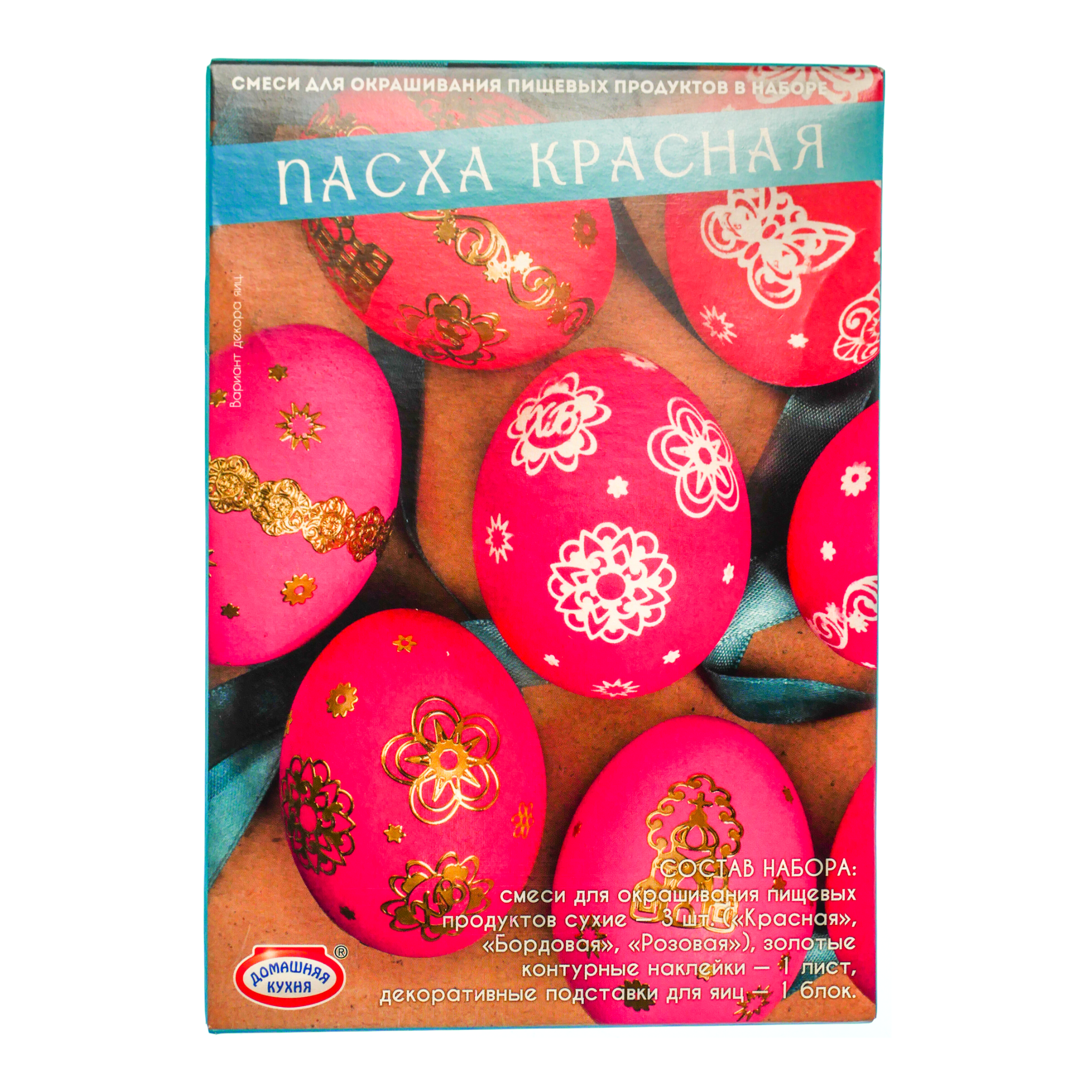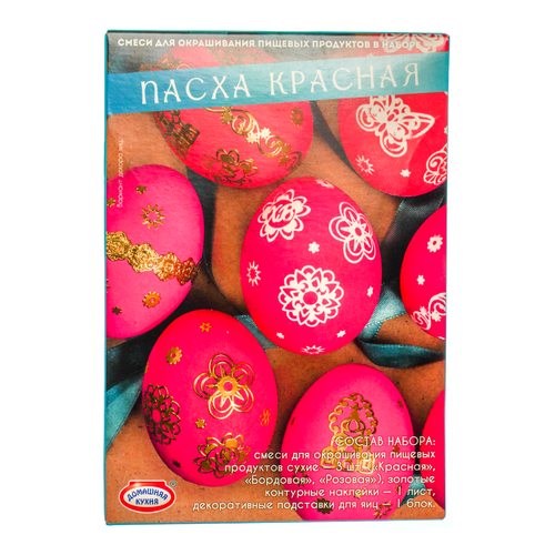 Набор для окрашивания и декорирования пасхальных яиц в красно-бордовых тонах. Набор предназначен для декорирования пасхальных яиц. Состав набора: смеси для окрашивания пищевых продуктов сухие: «Красная», «Бордовая», «Розовая». Наклейки ажурные - 1 лист. Декоративные подставки для яиц - 1 блок.