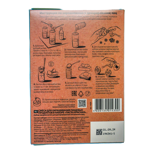 Состав: Мальтодекстрин, разрыхлитель (E500ii), загуститель (E1400), стабилизатор (E470), носитель (E460i), красители пищевые (E122, E124, E129). Наклейки ажурные (ПВХ). Декоративные подставки для яиц (картон).