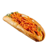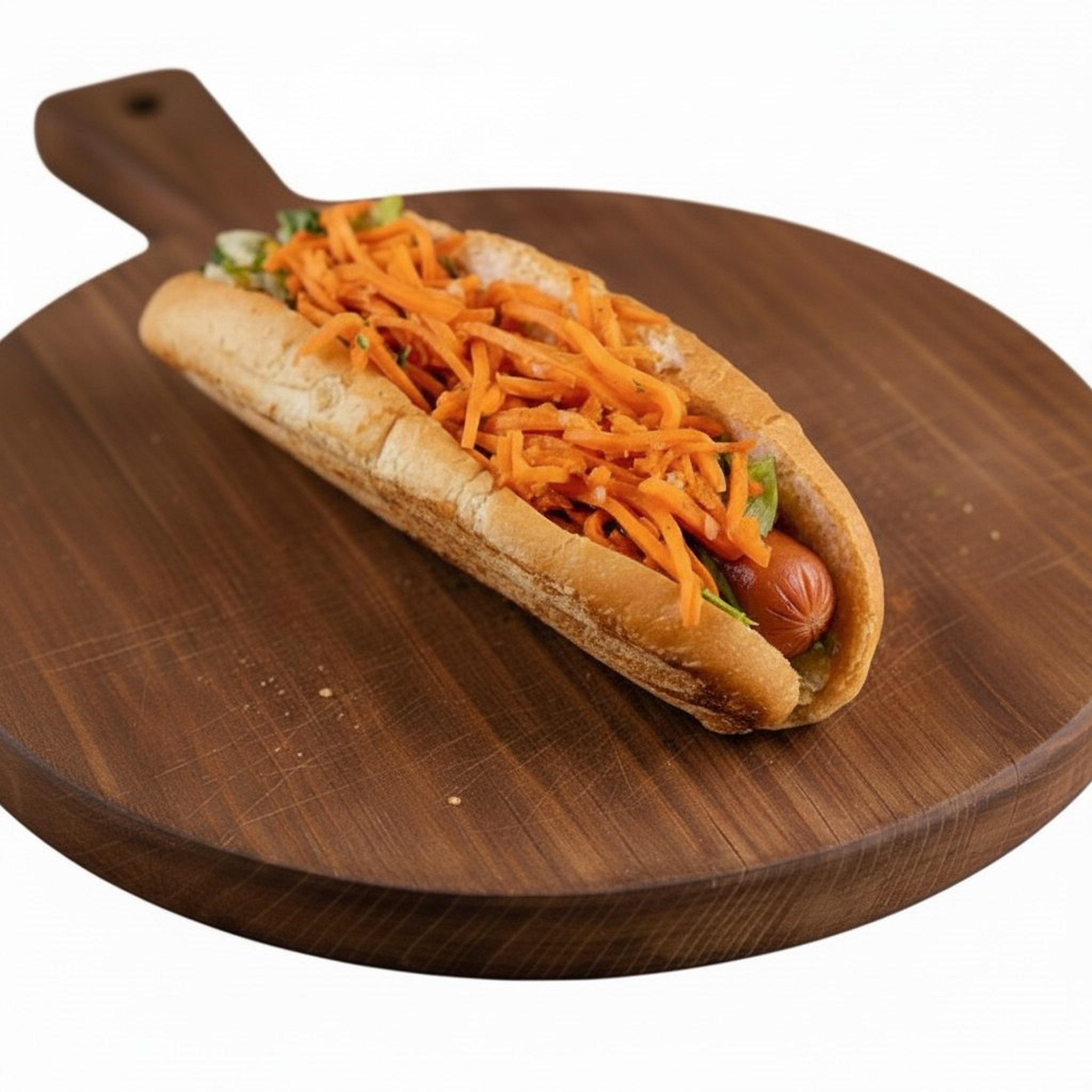 Сочная сосиска гриль в пшеничной булочке, с морковью по-корейски, заправленная соусом.