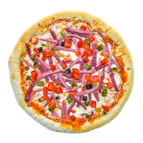 Пицца на тонком фирменном тесте с домашним соусом, ароматной колбаской, пикантными маринованными огурчиками и сыром моцарелла. Диаметр пиццы 25 см.