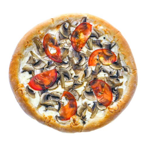 Пицца на тонком тесте со сливочным соусом, большим количеством грибов и сыра моцарелла. Диаметр пиццы 25см.