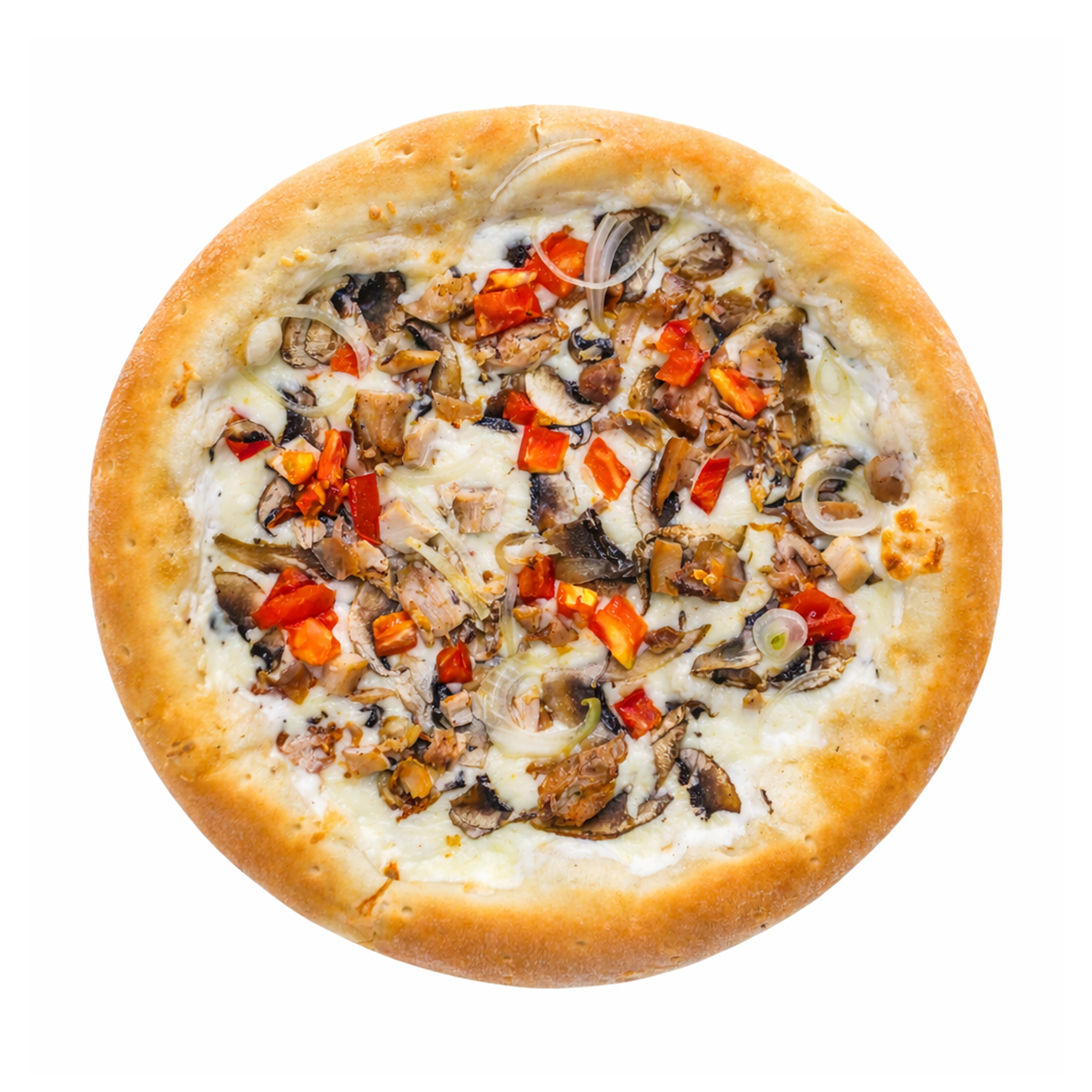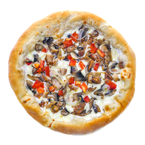 Пицца на тонком фирменном тесте со сливочным соусом, курочкой, грибами и сыром моцарелла. Диаметр пиццы 25 см.