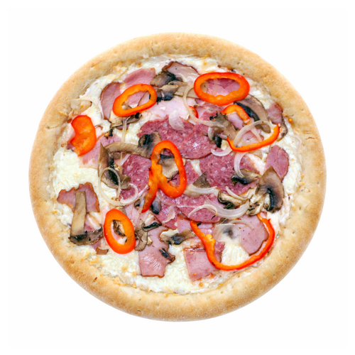 Пицца на тонком фирменном тесте со сливочным соусом и добавлением мясных деликатесов, свежих овощей и сыра моцарелла. Диаметр пиццы 25см.