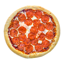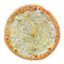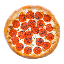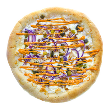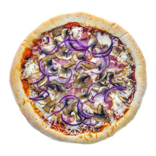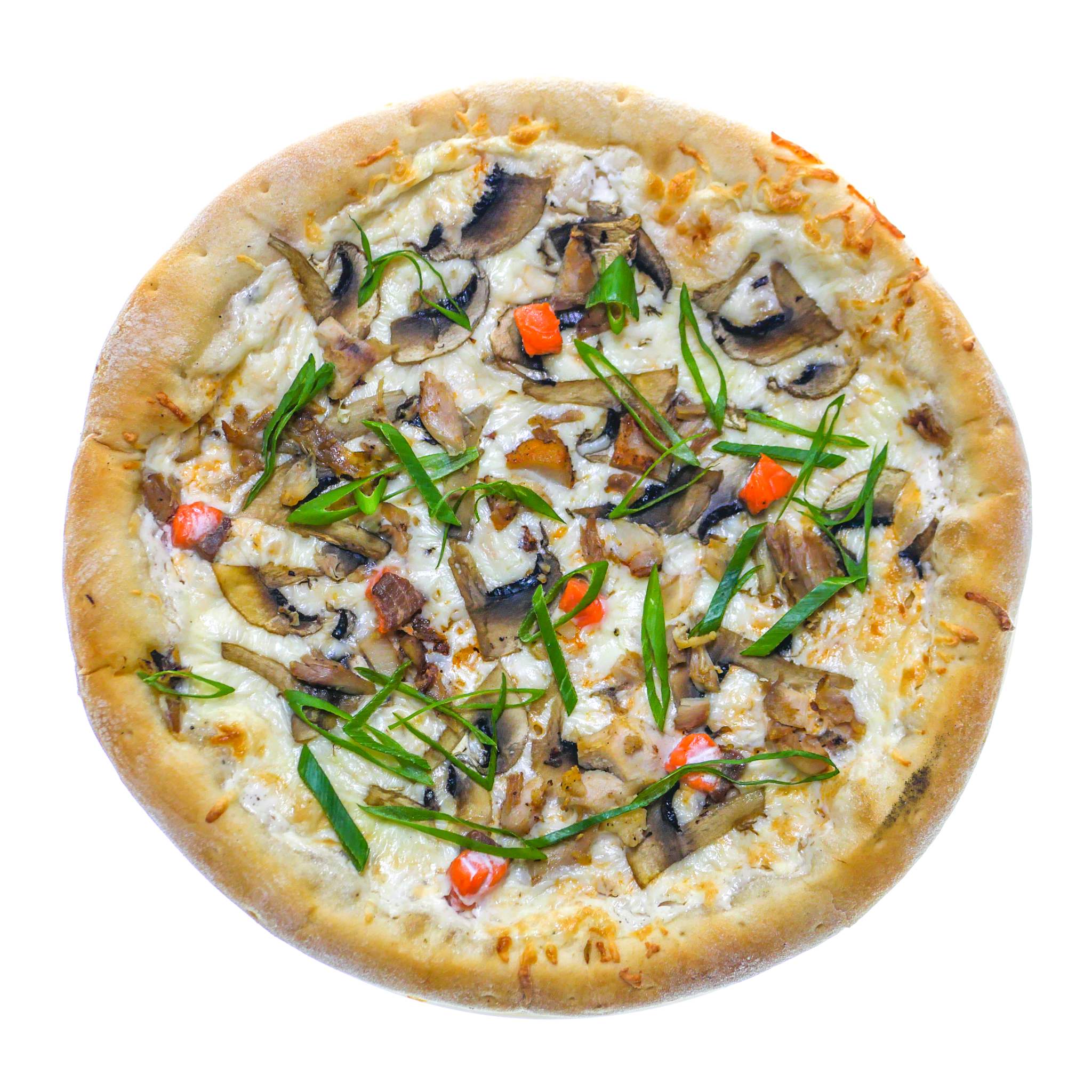 Пицца на тонком фирменном тесте со сливочно-пряным соусом, жаренной курочкой, свежим лососем и грибами, посыпанная зеленым лучком.  Диаметр пиццы 25 см.