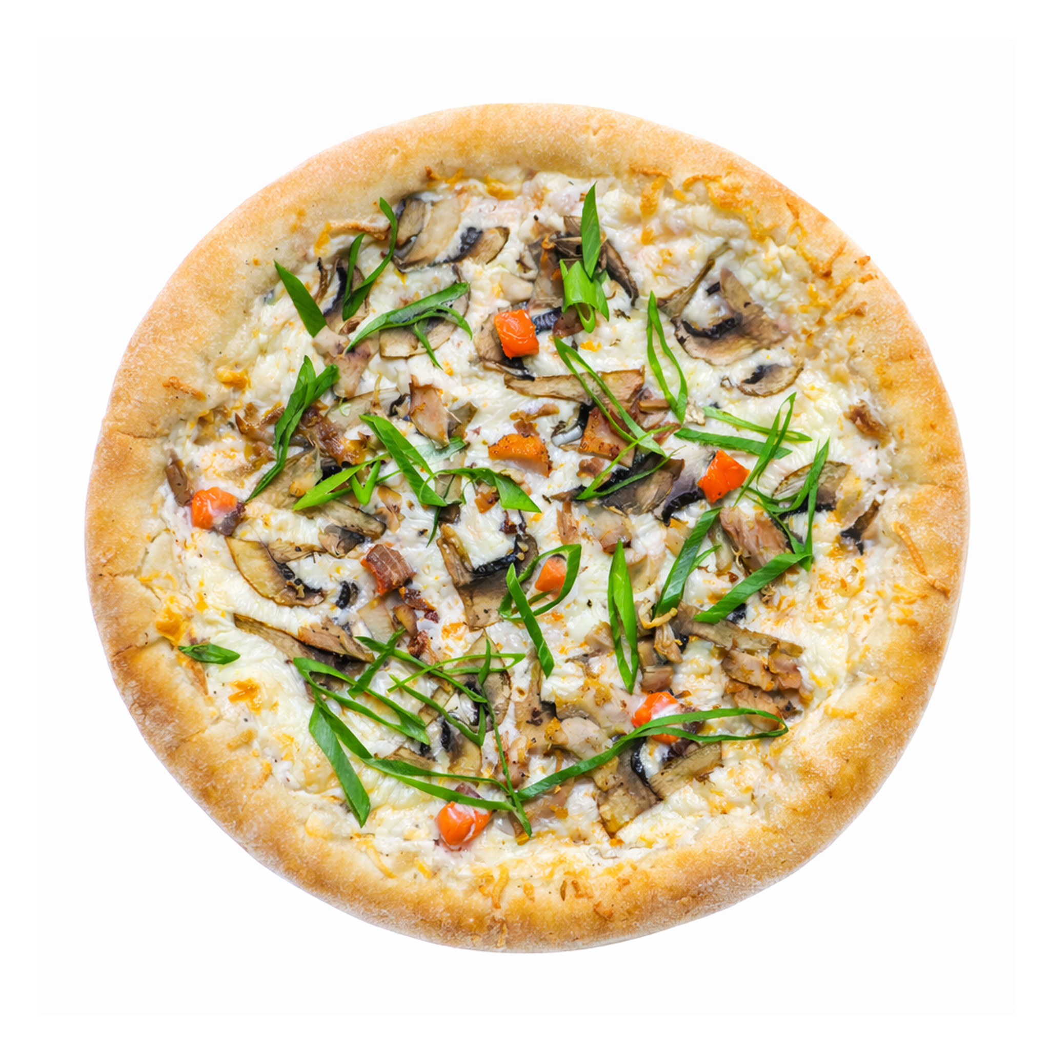 Пицца на тонком фирменном тесте со сливочно-пряным соусом, жаренной курочкой, свежим лососем и грибами, посыпанная зеленым лучком.  Диаметр пиццы 25 см.