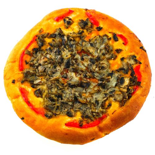 Состав: Мука, вода, дрожжи, сахар, соль, масло растительное, шампиньоны свежие, томаты свежие, перец болгарский, майонез постный, зелень.
