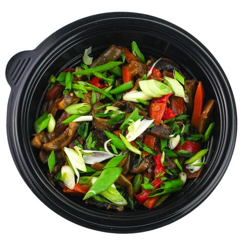 Состав: Лапша гречневая, фасоль стручковая, лук репчатый, масло растительное, морковь, шампиньоны свежие, перец болгарский, соус соевый, лук зеленый, кунжут.