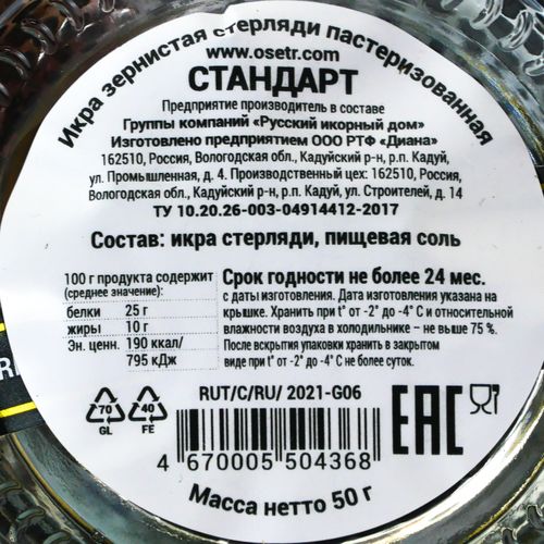 Икринки стерляди пастеризованной имеют более упругую оболочку, однако, в сравнении с пастеризованной икрой осетра, она имеет более выраженный вкус.