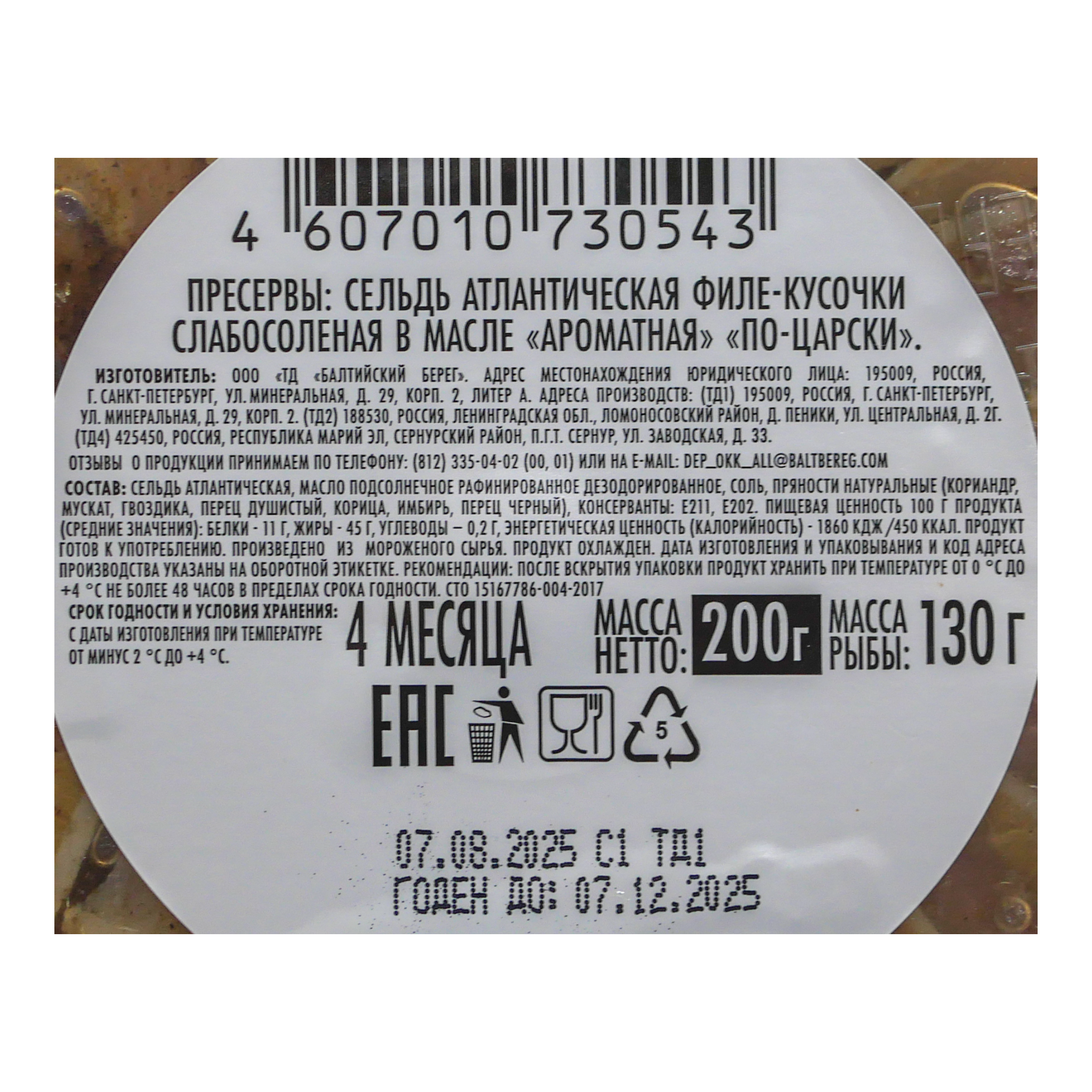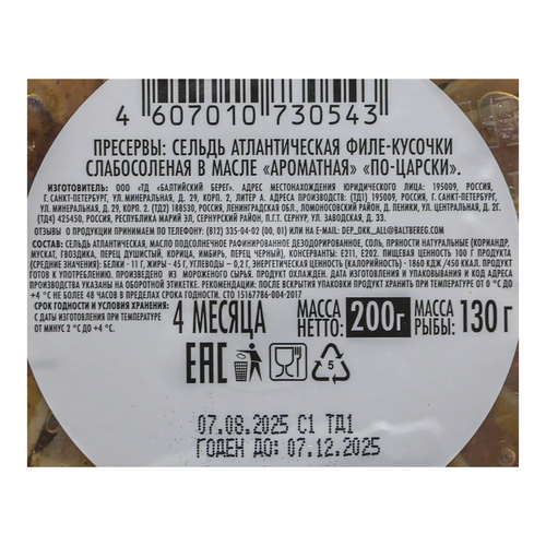 Пресервы сельдь 200г по-царски ароматная в масле Балтийский берег