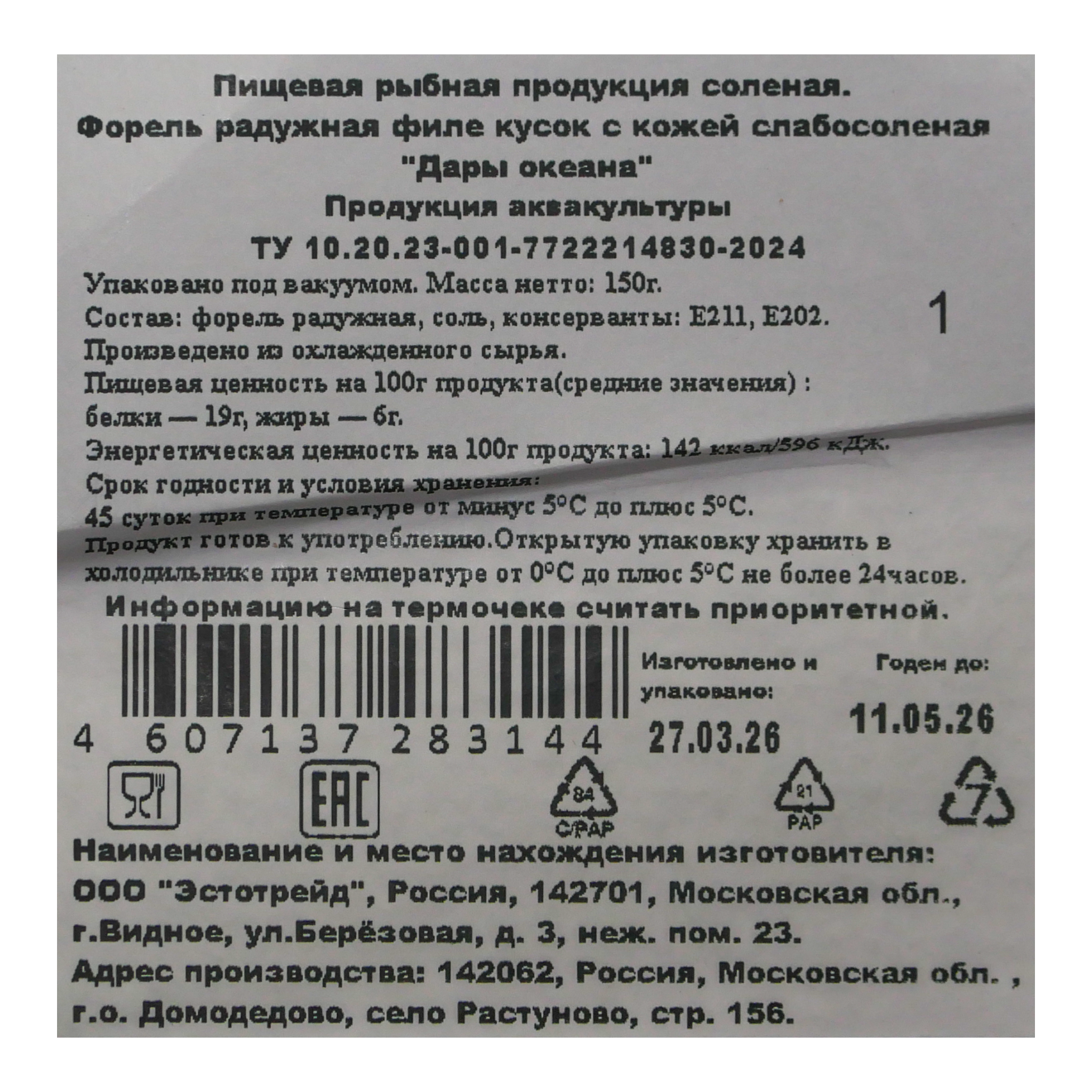 Форель Дары Океана 150г филе-кусок с/с в/у