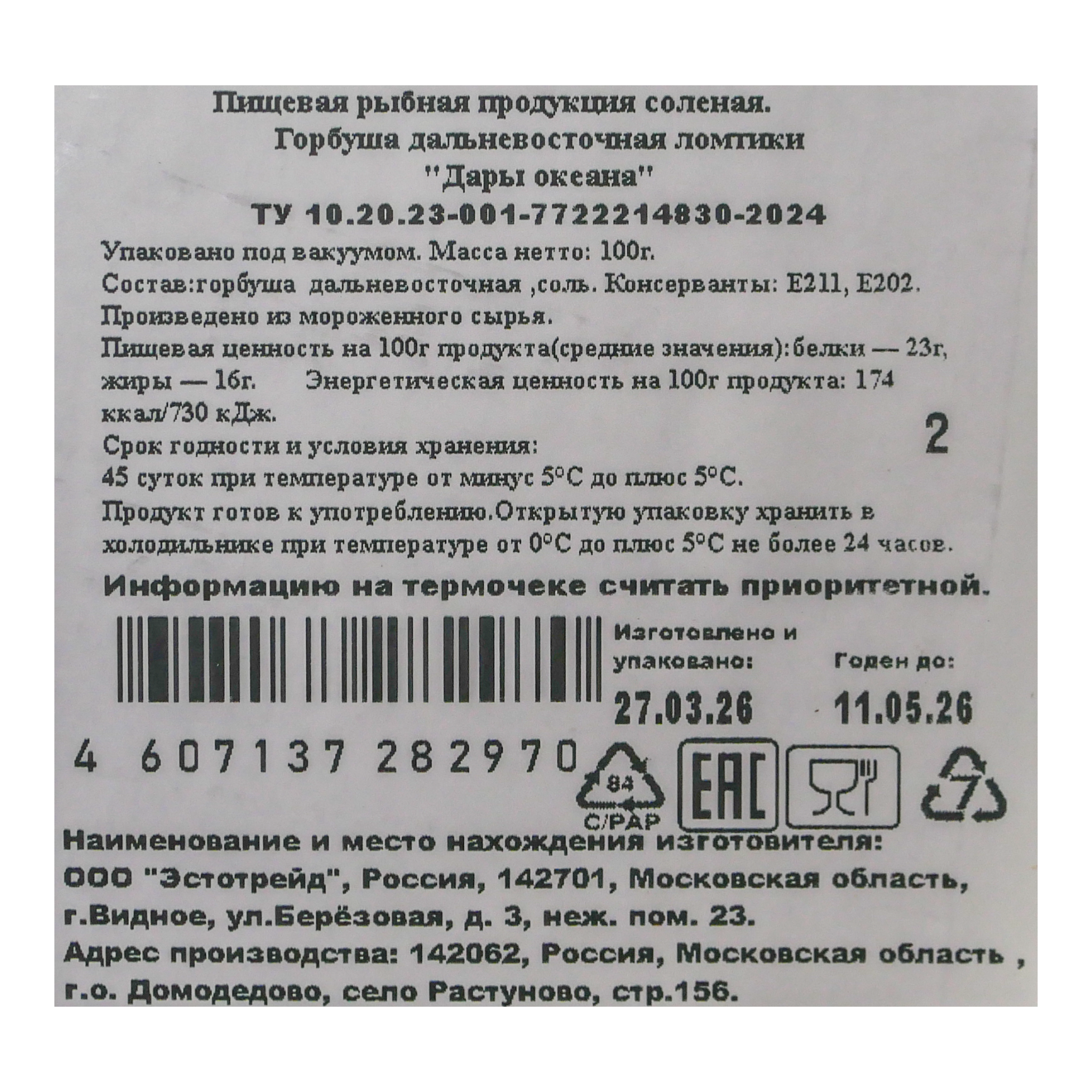 Состав: Горбуша дальневосточная, соль, консерванты Е211, Е 202.