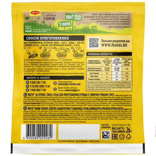 Приправа MAGGI «На второе» для курицы в сливочно-грибном соусе помогает быстро и вкусно приготовить сочное куриное филе. Для этого нужно всего 15 минут и два простых ингредиента. Покупать грибы отдельно не нужно, так как кусочки грибов уже находятся внутри упаковки. Продукт может содержать молоко, сельдерей.