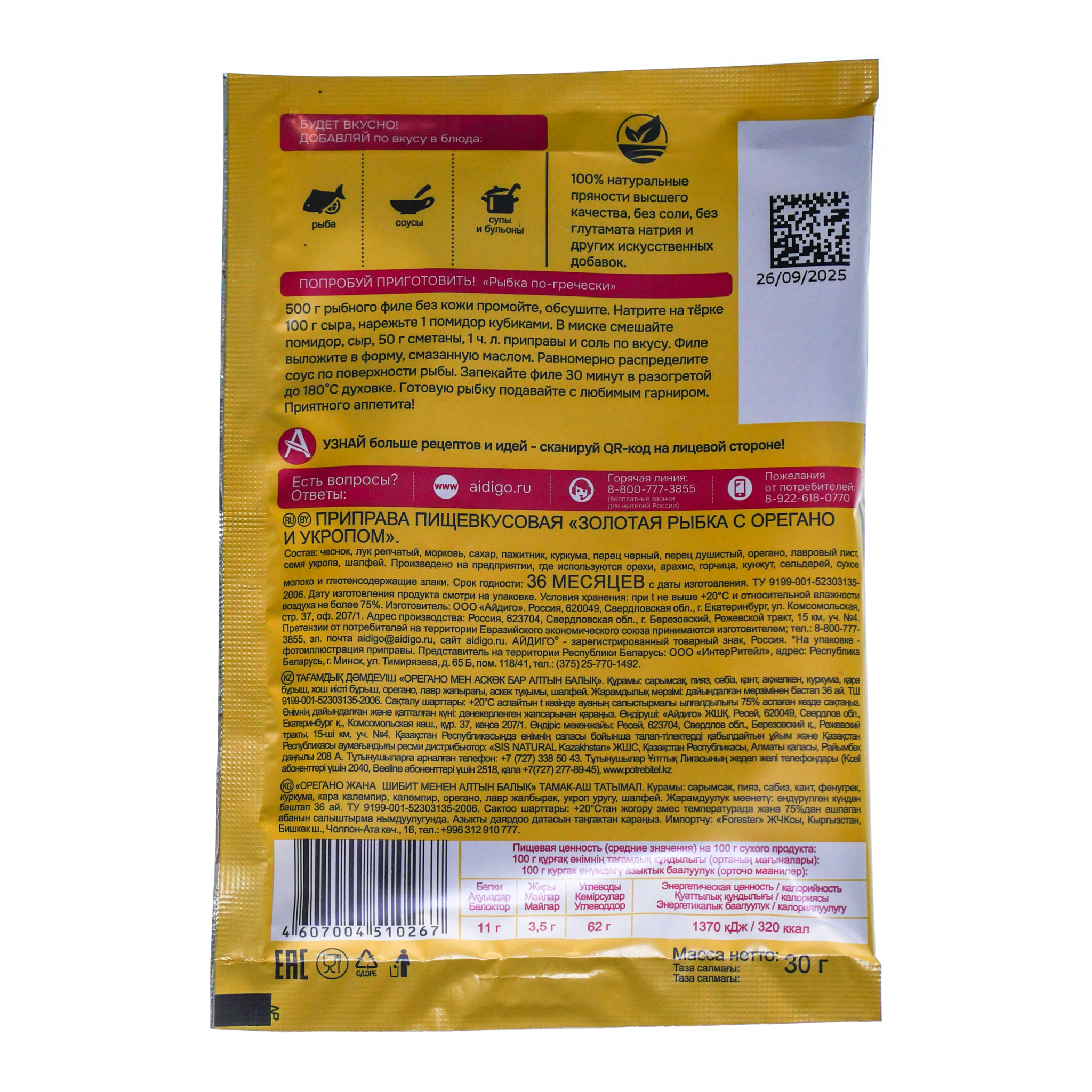 Приправа для рыбы Айдиго 30г золотая рыбка орегано-укроп