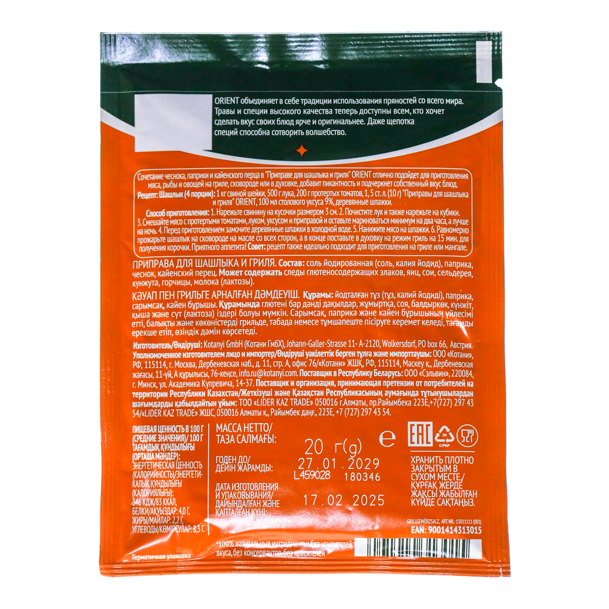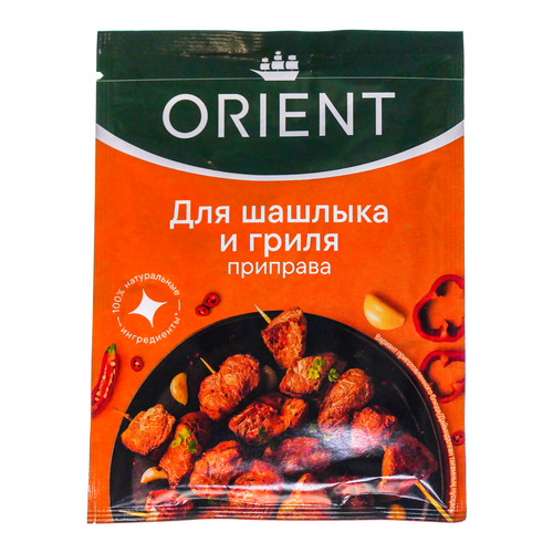 "Приправа для шашлыка" ORIENT придаст блюдам, приготовленным на гриле или сковороде, аппетитный запах дымка и пряный вкус.