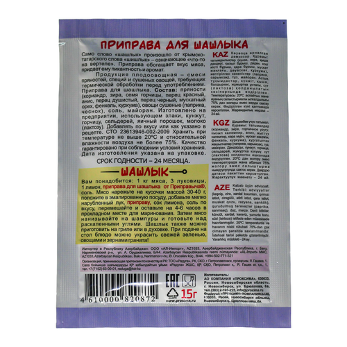 Само слово "шашлык" произошло от крымско-татарского слова "шишлык" - означающее "что-то на вертеле". Приправа придаст вашему шашлыку особый ароматически-пряный колорит и подарит прекрасный вкус.