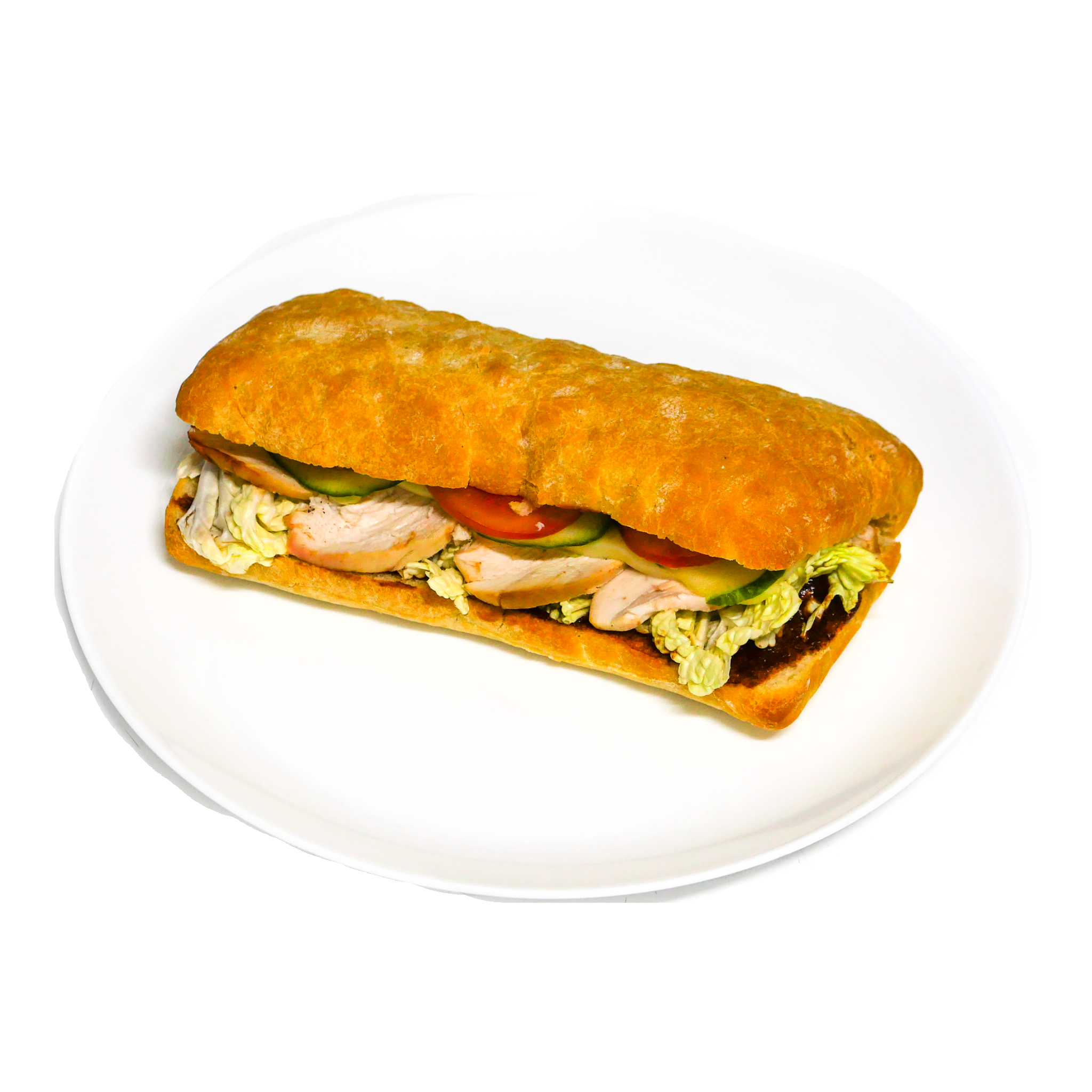 Хрустящая чиабатта с начинкой из отварного куриного филе с овощами, сыром и соусом.