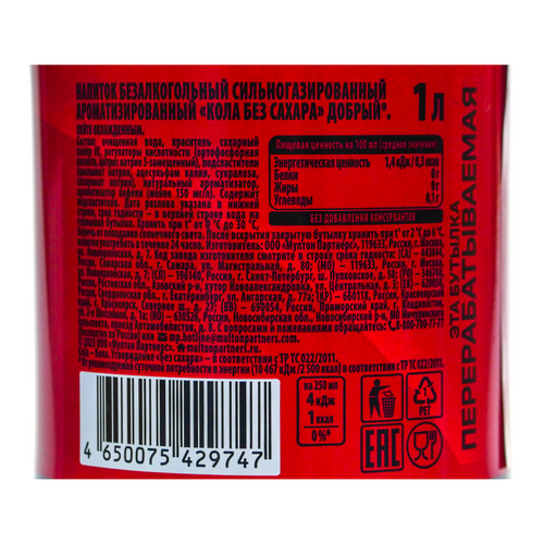 Новый сильногазированный напиток Добрый «Кола без сахара» — яркий вкус без калорий. Освежающий заряд хорошего настроения, которым так хочется делиться с тем, кто рядом! Пейте охлажденным.