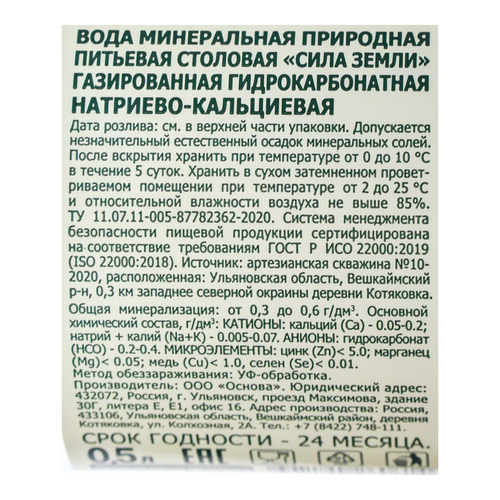 Вода минеральная природная питьевая столовая "Сила земли" газированная гидрокарбонатная натриево-кальциевая. Источник: артезианская скважина №10-2020 Ульяновская обл. Вешкаймский район 0.3 км западнее северной окраины д. Котяковка.