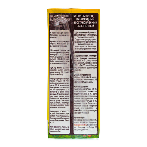 Яблочно-виноградный сок «Дары Кубани» объёмом 0,2 л — натуральный осветлённый сок. Приготовлен из концентрированных соков сочных яблок и винограда, без добавления сахара, консервантов и красителей. Рекомендован детям старше 6 месяцев. Сок можно пить не только в чистом виде, но и использовать для приготовления разнообразных коктейлей.