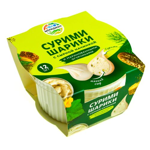 Сурими-шарики МЕРИДИАН с мягким сыром и маринованными огурчиками – это полезный, легкий и очень вкусный перекус. Оболочка шарика сделана из рыбного фарша (сурими), а внутри – начинка из мягкого сыра с маринованными огурчиками. Шарики упакованы под вакуумом в эргономичный стаканчик, который удобно взять с собой. Таким блюдом удобно перекусить после тренировки, на работе или можно подать его на стол как оригинальную закуску. Возможно наличие следов ракообразных.