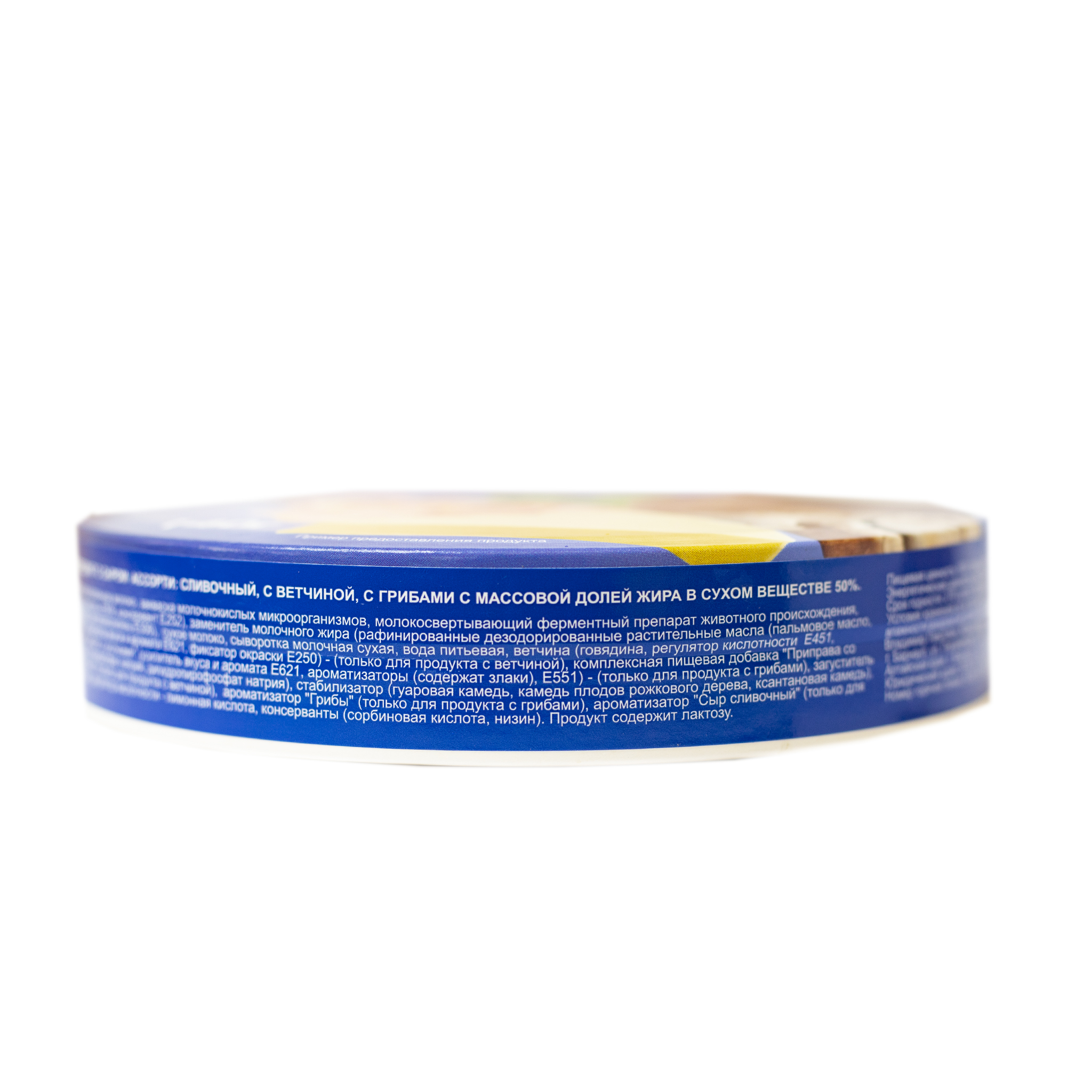 Состав: Сыры, масло сливочное, молоко сухое обезжиренное, концентрат молочного белка, эмульгаторы (Е331, Е339, Е450, Е452), регулятор кислотности лимонная кислота, соль, консервант низин, вода питьевая.