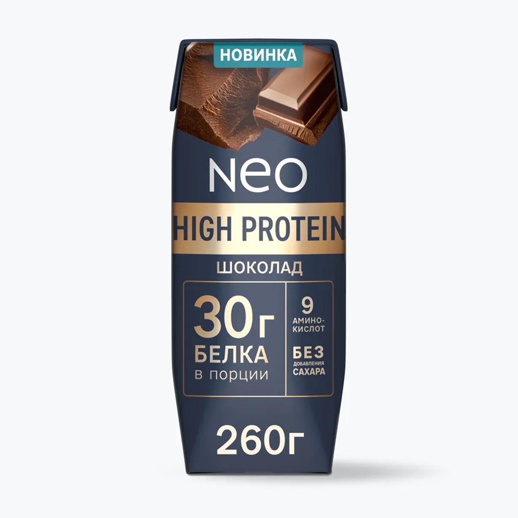 Коктейль молочный NEO HIGH PROTEIN обезжиренный, высокобелковый с шоколадом – новинка для восполнения суточной нормы белка без добавления сахара, содержит кальций.